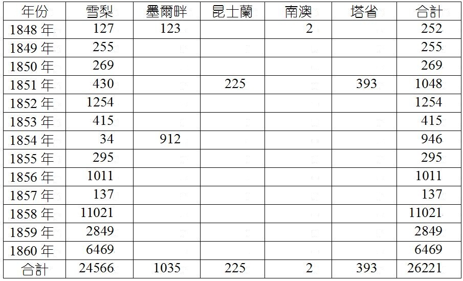 淘金潮前所引进的华工在数量上很难统计了,但在来源地却很清楚,其中包括福建、广东、潮汕、广州及香港,多是被招募的合约华工,少部份是随其[