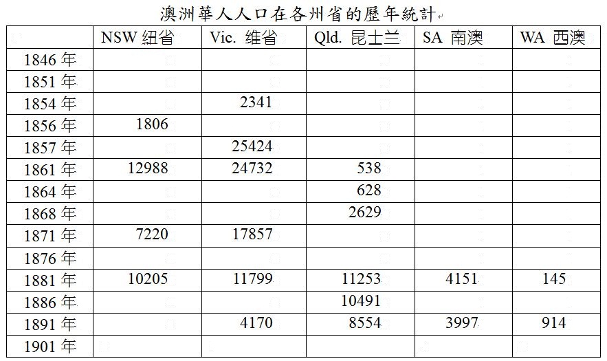 1850年之前澳洲并没有对在澳华人作统计,无论政府或社会舆论的关注点历来在引进华工的优劣比较及已有华工的个人品德方面的探讨(华人犯罪的情况在1832年前后已有发生,且在报纸上有所报导)。