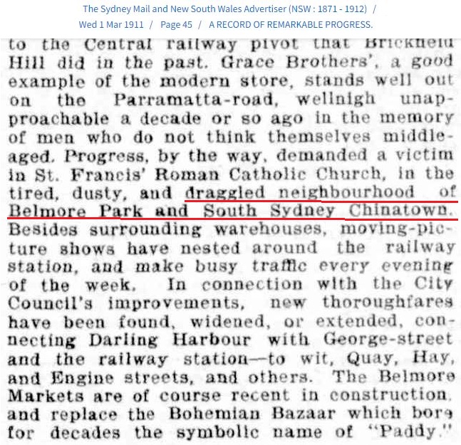 在大多數的專著中說到的雪梨唐人街往往是岩石區TheRocks就跳到現在華埠Chinatown,但實際上雪梨唐人街的位置在過去的百多年是隨着雪梨的發展及華人社區的變化而有所變遷。