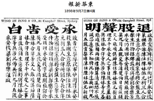 雪梨唐人街雜錄(29)1898年東華新報的出版,對雪梨唐人街的影響甚大,一方面是澳洲華人的第一間有限公司(共5000股,每股4司連,合計2000英鎊),另一方面是華人社會派別鬥爭將慢慢從隱蔽轉向公開。早期華人社會派別繁多,義興沒有地域之分,其他堂口多依地域或分或合,但多以團體內或雪梨本土的慈善活動為主。1893年前雪梨華商的領軍商號為新錦泰及安昌為首。新錦泰[