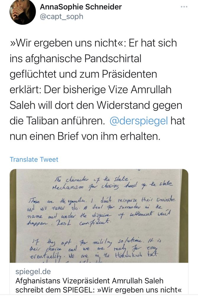 现任副总统阿姆鲁拉·萨利赫逃到阿富汗潘吉尔山谷,并宣布自己为总统。