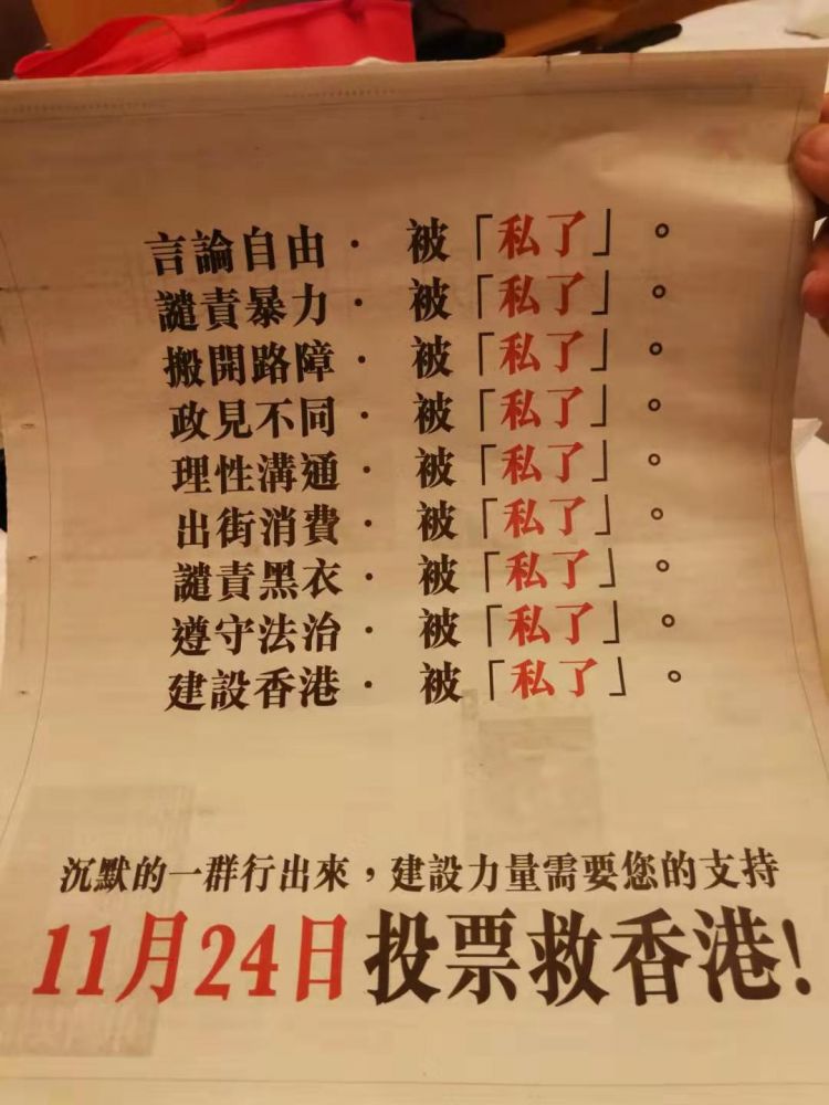 2.中午在弥敦道看到一个贴反动标语的女孩,偷偷摸摸,行为猥琐。晚上看到一个发报纸的老妇,习惯性的领了一份,后来开始自责自[