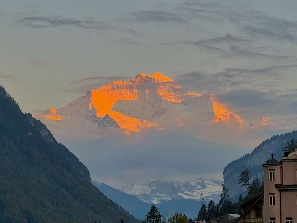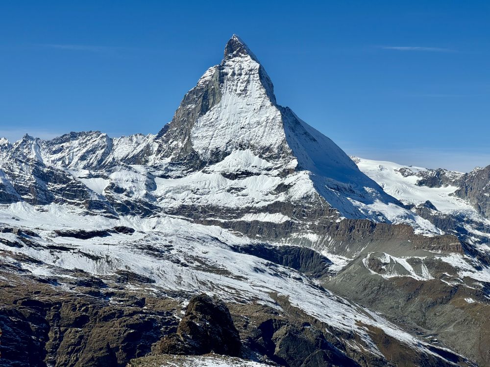 这次来瑞士最大的一个愿望就是要去看看马特洪峰(Matterhorn)。马特洪峰是欧洲最高的山峰之一,海拔4478米,位于瑞士和意大利的交界处。马特洪峰以其独特的锥体金字塔形山峰闻名于世,它不仅是阿尔卑斯山的标志性景观,而且并被誉为世界上被拍摄次数最多的山峰。我们上次来瑞士时没能见到马特洪峰,这次来瑞士自然不想再错过。