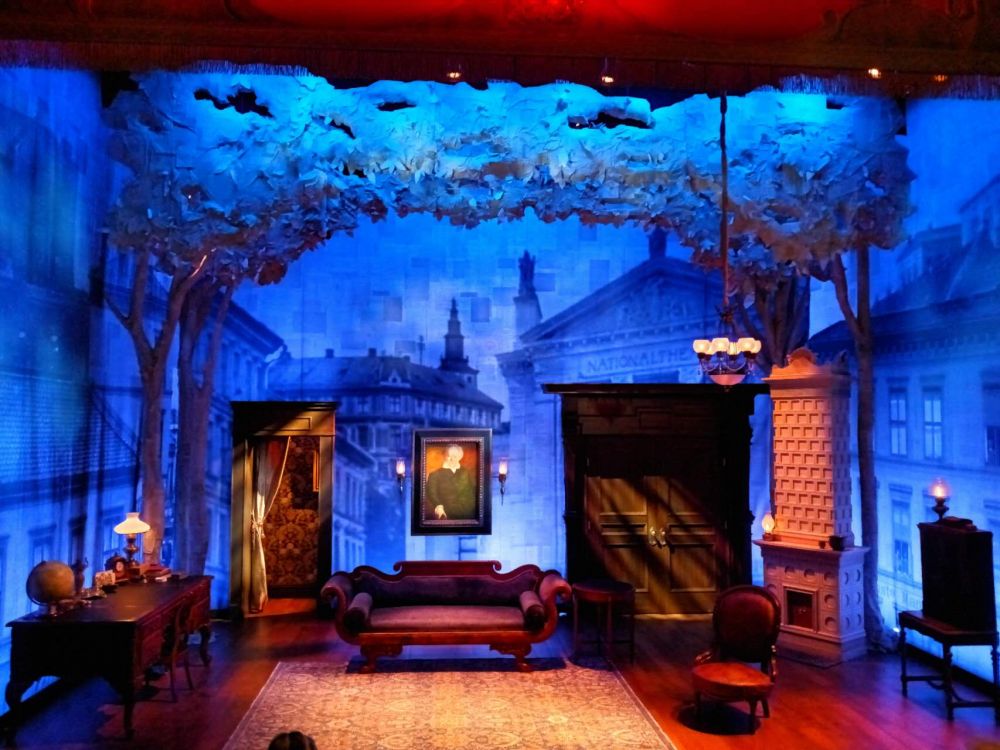 近日找空看了《易朴生家的鬼》这部小话剧,有些想法说一说。我惦着看它,原因之一是海报上是一位着十八世纪衣裙的中年女士,感觉应该比现代剧多点内涵,且女主中年。以我推测,比年轻女主有故事。确实挺有故事。舞台场景是易普生家的客厅。先有个身手敏捷的人上场到处踅摸。随后出场刚参加完著名剧作家易普生葬礼的他夫人苏珊娜。再后是剧评家及家庭好友出场[