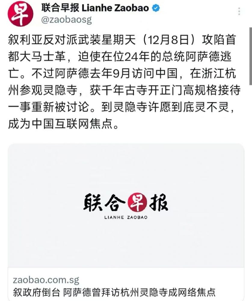 叙利亚政府垮台,前总统阿萨德逃往莫斯科避难,这本来是中东地区的大变局,远在万里之外的灵隐寺却背了黑锅。因为去年九月,灵隐寺罕见地开正门铺红地毯迎接阿萨德,按常理猜测,阿萨德肯定许下“江山永固”的宏愿,有德高僧绝对给阿萨德夫妇抽出上上签:仙福永享寿与天齐千秋万代大马是戈。但一年零三个月后,阿萨德就丢了江山,仓皇辞庙时,连垂泪对宫[