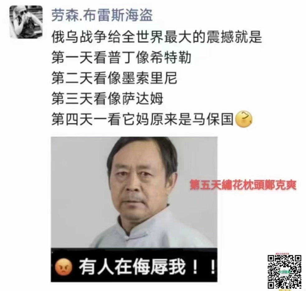 俄粉终于扬眉吐气了一回,以前被西方霸权的双标伤透了心,现在也能在俄乌战争上双标一把了——他们一边批判秦桧的投降主义,一边批评泽连斯基的不投降;一边痛斥汉奸,一边痛恨乌克兰人不当乌奸。理直气壮地不讲理,感觉应该很爽的啦。有些俄粉假装同情乌克兰,情调很奇特,是“哀其不幸,怒其抗争”,认为乌克兰人不以屈服换来岁月静好,反而抵抗[