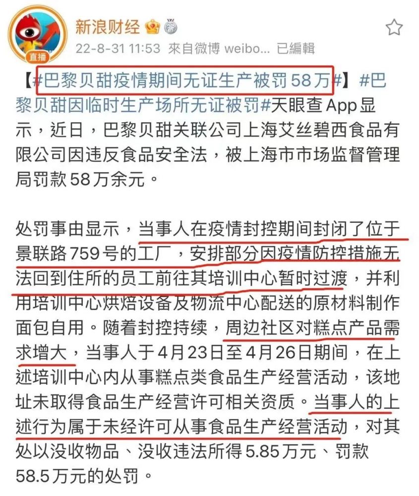 按说上海巴黎贝甜这事儿还应该有后续,因为市场监督局在公告中留了一个活扣:“目前,案件尚在法定行政复议和行政诉讼权利救济期间,企业可以通过法定程序提出异议,我们将积极妥善做好相关工作。”估计巴黎贝甜不会装外宾,竟会天真地提出行政诉讼,万一官司打赢了,以后会输得更惨。简单回顾一下剧情:今年四月,巴黎贝甜的工厂封闭了,部分员工暂住培[