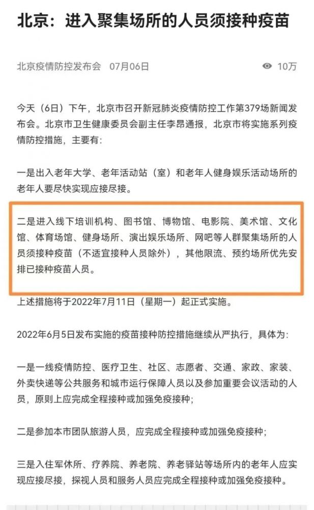7月6日,北京卫健委副主任李昂代表防控办发布最新防疫措施:进入聚集场所的人员须接种疫苗!