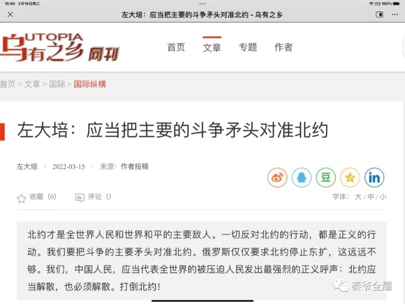 昨天,看到秦爷在文章里上了几张《乌有之乡》的文章图片,发现一贯“严肃”的乌有之乡也有搞笑的时候。支持俄罗斯反对乌克兰,乌有之乡这种态度不仅搞笑,而且背离了自己的初[