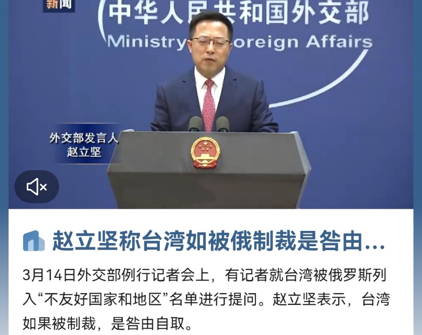 3月14日,职业唠嗑人赵立坚回答记者提问:如果俄罗斯制裁台湾,那是(台湾)咎由自取。在大庭广众之下公开袒护俄罗斯,说这种亲痛仇快的话代表了谁的利益?台湾民众是同胞是自家兄弟,对同胞落井下石,胳膊肘往外拐,屁股坐在谁一边?不论俄罗斯跟赵发言人家的领导关系多好,顶多算是临时结拜,哪能比台湾天生一家亲兄弟近?说好的“血浓于水&r[
