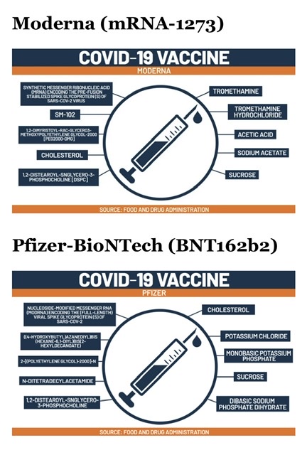 Moderna和PfizerCOVID-19疫苗都含有四个部分:mRNA,脂质,盐和糖。