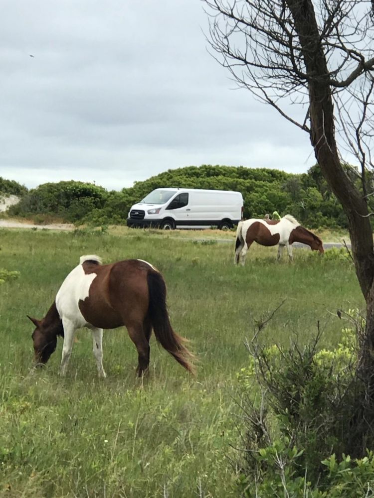 今天下午三点左右雨虽然停了,但风还是挺大的。在源源的强烈要求下,我们顶着风观过海浪后,又驱车前往野马的聚集地一一马里兰国家公园去看野马!她在路上做了一个统计:整个马里兰州有七十八匹野马,她一共只看到了二十二匹!说她明天还想去呢!不过来看野马的人还真不少!只要有野马的地方,就有许多人和车!