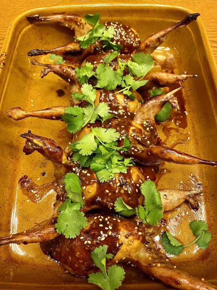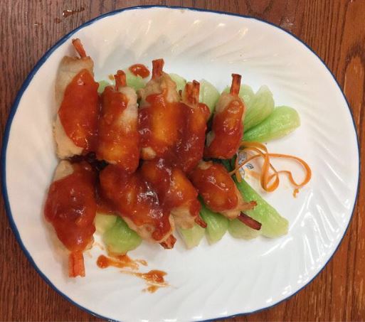 前几年,表姐跟我游苏州的时候,特请我吃了一家,当地颇为有名的饭店里的名菜—--鞭炮鸡卷。那菜模样还真像鞭炮一样鲜红红的。