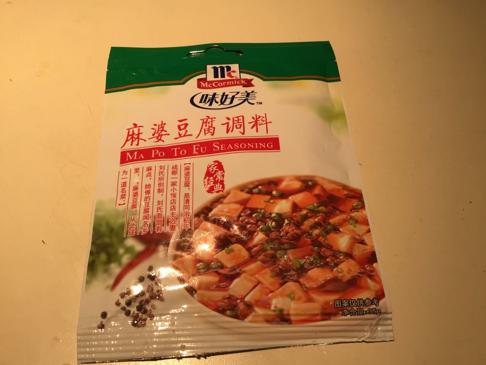 懒妇朋友送我一包麻婆豆腐调料,看看牌子McCormick是个名牌,很多中美超市都有它的各类小瓶调料粉,放架上卖。但我是很挑剔的厨子,不太相信这种“懒人包”,故放在厨柜里,不打算用了,过去一,两年变旧货就归置到垃圾桶里。