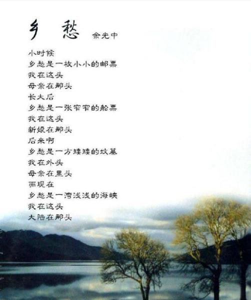 《乡愁》是现代诗人余光中于1972年创作的一首诗歌。诗中通过“小时候”“长大后”“后来啊”“而现在”这几个时序语贯串全诗,借邮票、船票、坟墓、海峡这些实物,把抽象的乡愁具体化,概括了诗人漫长的生活历程和对祖国的绵绵怀念。全诗语言浅白真率,情感深切。