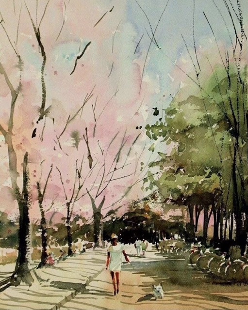 开车路过法学院,就看到了那排盛开的樱树,粉粉的,无一丝杂色的花瓣顶在树梢,象粉色的云那般轻柔。这样的浅粉色在晴空烈日下,会显得有些苍白,而今天正好,天有些阴,有细细的雨丝斜斜地飘下来,在略显暗淡的天光下,樱树显得柔美,婀娜,象极了花季少女。我的车从树下经过,一阵微风吹起,花瓣飘飘洒洒向四处飘散,感觉象在花雨中穿行,周围万赖俱寂,[