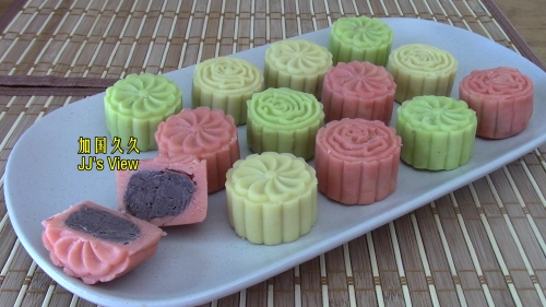 外皮除了原色外,新加了草莓和哈密瓜两种风味。外皮包裹馅料做成饼坯,再用月饼模具把饼坯压成形。