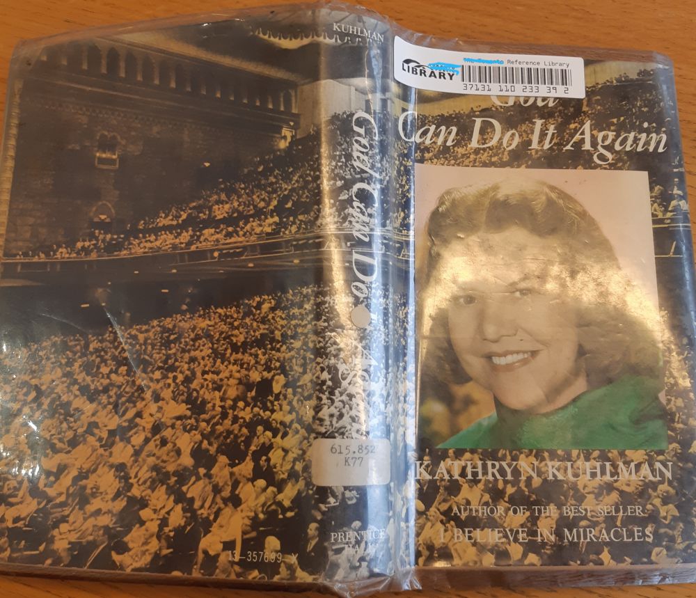 KathrynKuhlman(1907-1976)是世界上最著名的医治牧者之一,YouTube可以看到她的“奇迹”敬拜和电视栏目“我相信奇迹”的记录。市图书馆有她的六本书,其中三本是她的传记,但都是孤本只能去Reference馆当日借阅,这本《GodCanDoItAgain/神能再行奇迹》是一本见证集,每章由当事人或医生叙述,第一章则是一记者参加并观察敬拜做的记录。看封面到内页上密密麻麻参加敬拜[