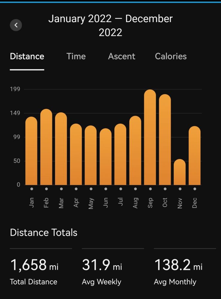 2022年是奔跑的一年。1.因为各种原因跑步训练有些起伏,前前后后大约有一个多月的时间没有跑步,其余的时间都在坚持每周约五天的跑步。总跑量1600多英里。