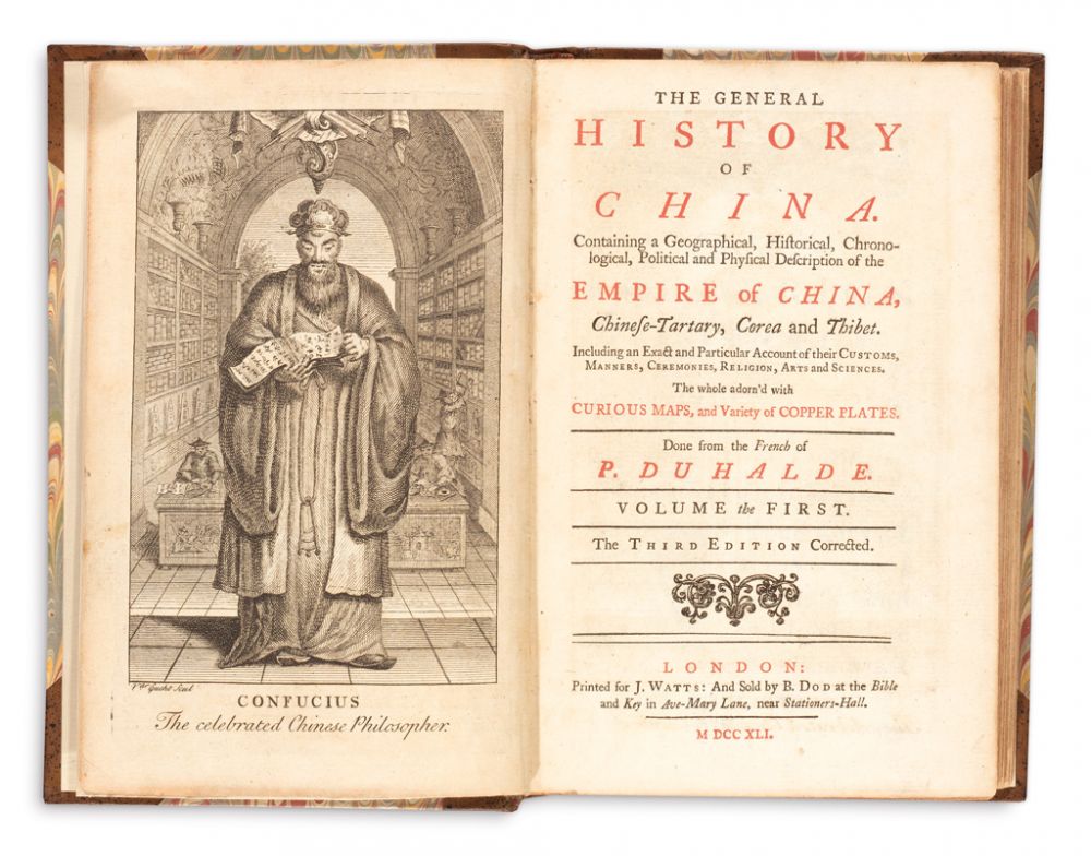 北美移民早期对同时期中国的了解都是从欧洲得到的。比如,美国最受尊敬的国父富兰克林,在1738年时阅读到一本巴黎出版的书,书名是《中华帝国全志》(图1、2),被誉为“法国汉学三大奠基作之一”。作者是位法国耶稣会历史学者杜赫德(Jean-BaptisteDuHalde)。杜赫德没有去过中国。书是他根据当时耶稣会17位传教士从中国寄回的报告编写而成的。从书的全名《中华[