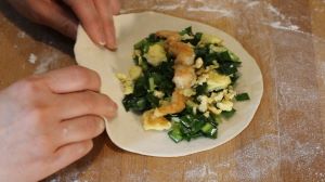 馅:150克韭菜,12个虾仁,3个大鸡蛋,1汤匙香油,1/8茶匙(1克)盐炒鸡蛋,1/8茶匙(1克)盐炒虾仁,1/4+1/8茶匙(3克)盐拌韭菜,1/2茶匙(2克)白胡椒粉