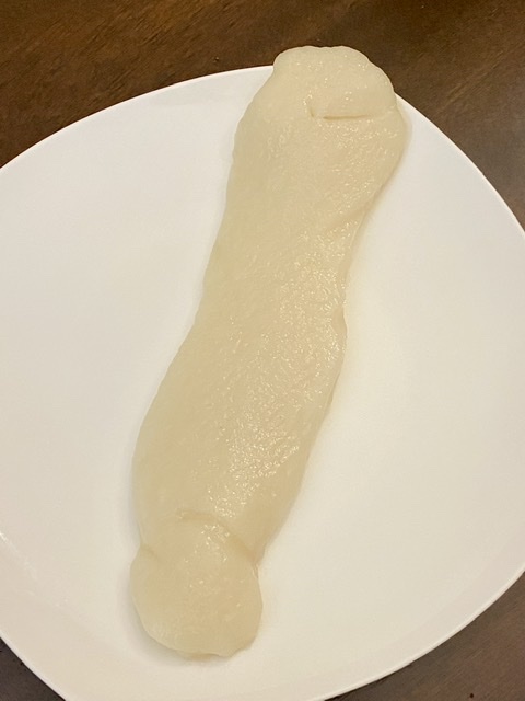 但没买年糕,自己用糯米粉做的,也象征性地用擀面杖凿了一会儿,