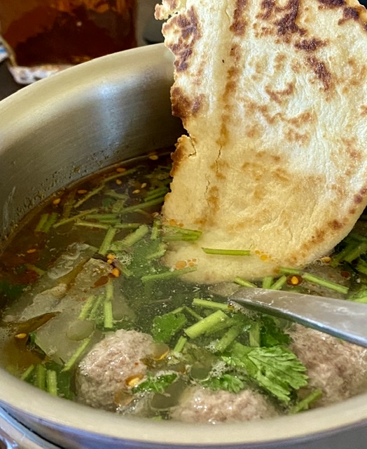 用一个最小的锅,煮水、冬瓜、羊肉丸子,香菜、辣椒油。
