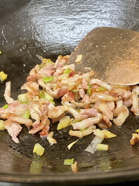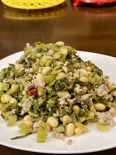 这样雪里蕻会湿气重,所以干锅烧热,先煸炒雪里蕻,不放油,直到水气蒸发,再放肉馅,也是干煸到水气蒸发,这时候沿锅边放一点油就可以了,一些干红辣椒圈,让它们贴着油煎香。