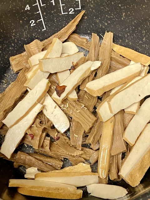 先说笋干和豆腐干。笋干泡了两天,昨晚煮了。豆腐干是祖名牌软香干。