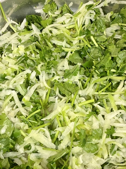 青萝卜现在比较水灵,用擦子擦的,想要烂烂的口感。加盐煞水。攥一下水。