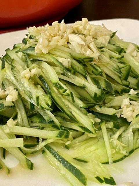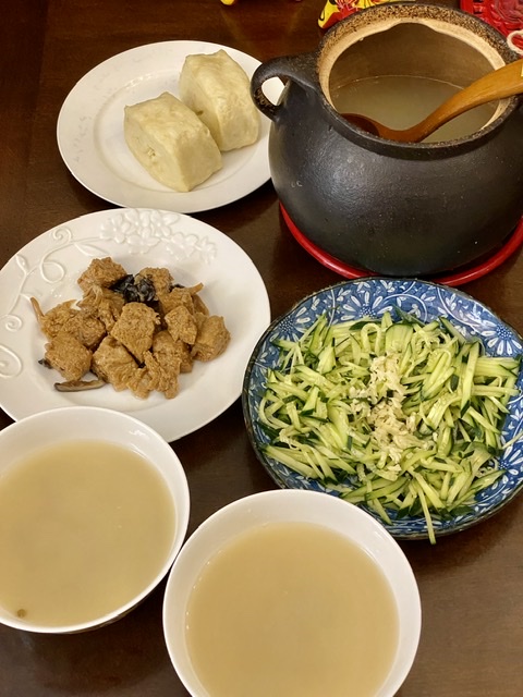 晚饭:玉米面馒头、绿豆大米小米糯小米玉米渣稀粥、凉拌黄瓜丝、四喜烤麸罐头