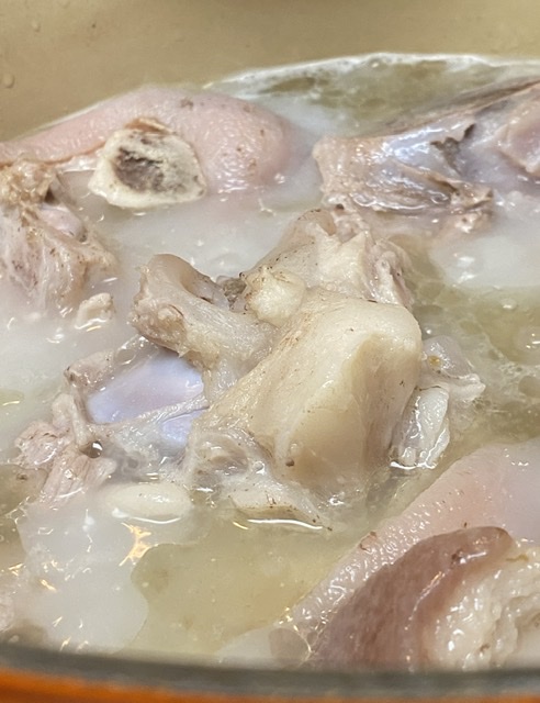 大骨焯水以后,温水冲干净,加开水炖2个小时,只加了姜,没加盐、料酒、葱...