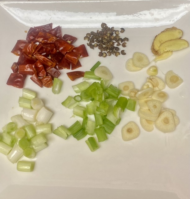 调料:干辣椒和花椒先下,辣椒糊了。有糊香味。不喜欢花椒可以先下,然后铲出来。