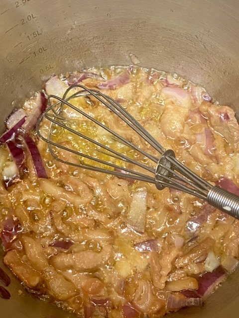 黄油半条化开,炒洋葱、蒜末和五花肉丝(我没有bacon)。