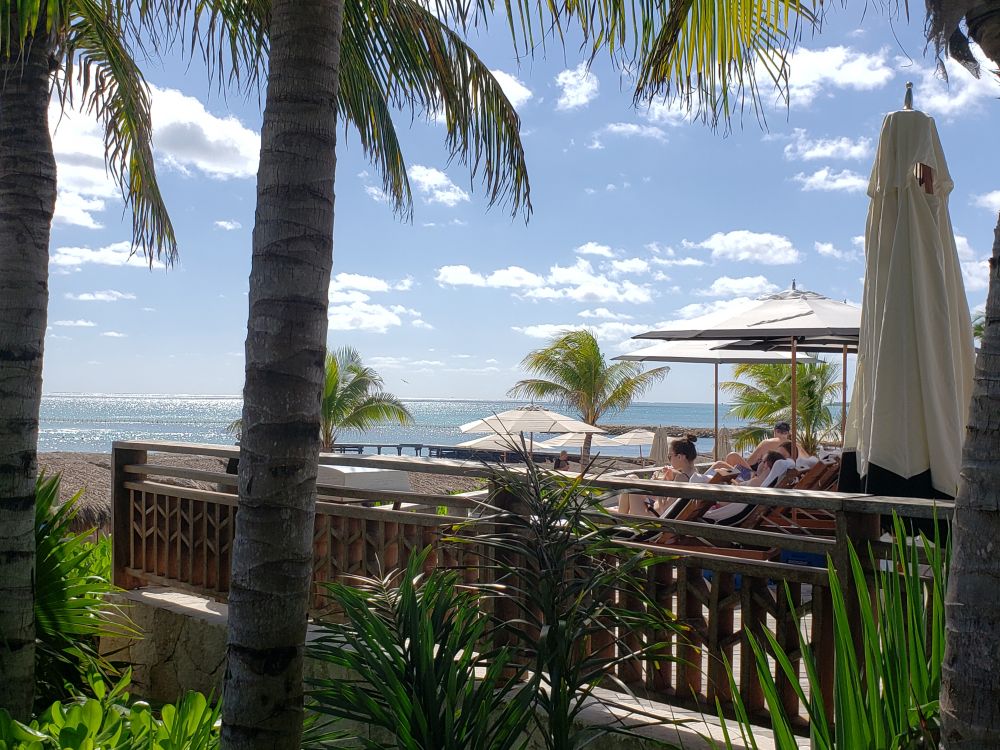 这个新开发区在海边上依坡而建,他们一行人从海边过来,只见沙滩上散布着几个茅草棚,实则是‘包间’,里面有餐桌,餐椅,摇椅,吊灯和灯柱,设计新潮,旁边有吊床和各色热带植物,非常浪漫。