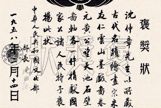 沈仲章先生以所藏古代名迹绘画宋米友仁云山墨戏图卷元黄公望天池石壁图轴各一件捐献国家公诸人民特予褒扬此状