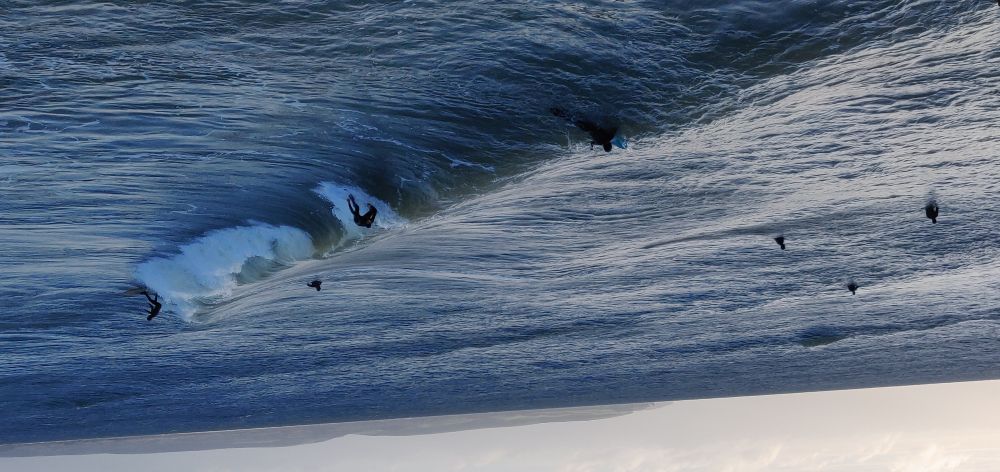 巴郎《伯恩茅斯游记》05搏海冲浪一一一一为了减少海水对海滩的冲击力,每隔不远,在海滩上就纵向修起一道防波堤,阻隔海水横向扩散。海风不小,吹得沙尘漫天乱舞。虽然是零下2度的气候,但感觉却有零下10度。深冬严寒,寒风透过衣帽,将寒气吹进了骨子里,冻得手脸彤红,使人颤悚寒战不已。裹紧外衣,走了好一段路程,才觉得身上热乎起来,驱走了酷寒,变得兴高[