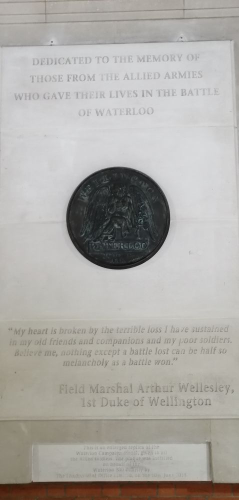 《威灵顿说》巴郎20250618在伦敦滑铁庐Waterloo火车站墙上,嵌有一块石碑,纪念在滑铁庐战场上死亡的联军士兵。上面写着:“想到离我而去的朋友、同伴、和可怜的士兵们,这么可怕的损失,使我的心因而破碎。相信我,虽然我们赢得了战争,但战争胜利的喜悦,也因此而极度逊色。战胜之哀痛,等同于战败之沮丧”。一一陆军元帅威灵顿公爵[