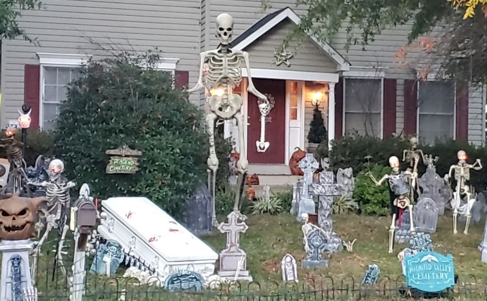 万圣节将至,各路小鬼闻风而动。有的被投射到墙上,上下飞舞;有的被挂到树上,随风而飘。更有热心的爱鬼邻居,在院子里布满墓碑,摆上大鬼和小鬼,还搬来一口棺材吸引众人。
