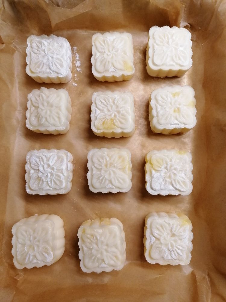 按照小高姐方子做到冰皮月饼,呵呵,每次都很抢手。这次是女儿下单,所以装在这个铝盒里,方便她带走。这次一共做了15个,这里的12个比较漂亮,女儿说很受欢迎。她们一共8个人,每个人都吃了一个。余下4个全进女儿肚子了,呵呵。被需要的感觉还是挺好的哈,中年大妈自我安慰一下,呵呵。[