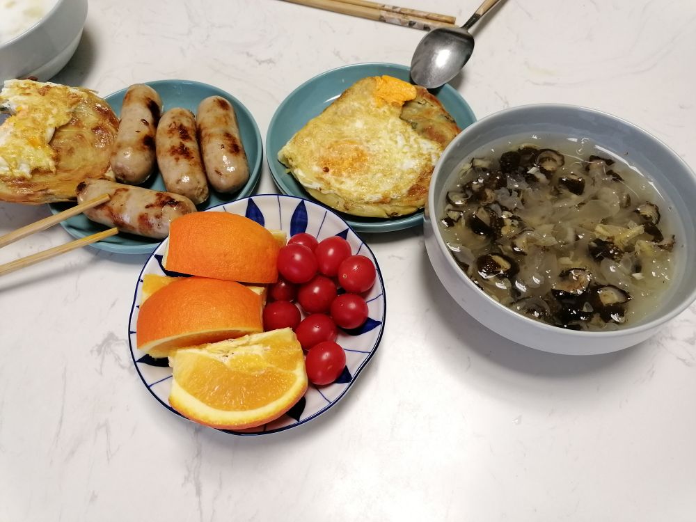 在上海的早餐,海参银耳粥,鸡蛋葱油饼,香煎烤肠,水果是圣女果和橙子,综合坚果没拍进画面。