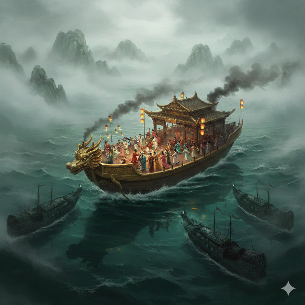 缥缈梦雾笼群峰山朦胧,碧波万顷隐艨艟。笙歌不觉危弦易海上虚无缥缈梦。[