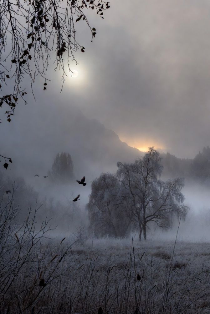 【鹧鸪天】冬雾淡月疏枝掩旧踪,寒烟迢递锁群峰。千林雾散初阳薄,数点鸦惊晓色朦。凝素野,隐霜钟。几回凝睇向空濛。忽闻深谷传笑语,顿记云山有路通。[
