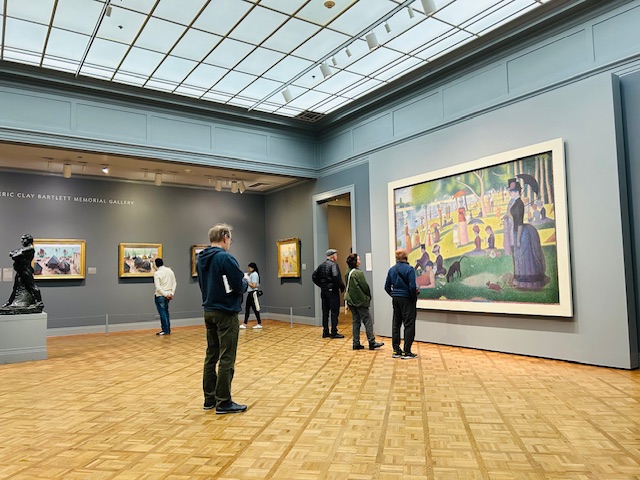 我在芝加哥住了30多年,芝加哥艺术博物馆是我最喜欢去的地方。在芝加哥艺术博物馆那间光线温柔的展厅里,总有一幅巨大的画吸引着人群慢慢停下脚步。那是一场看似平静的野餐,阳光、草地、河岸,还有一群沉默得几乎令人心疼的巴黎人。他们不在说话,也不在笑,仿佛在等待什么永远不会来的事。—这,就是乔治·修拉(GeorgesSeurat)的名作:《大碗岛的星期日[