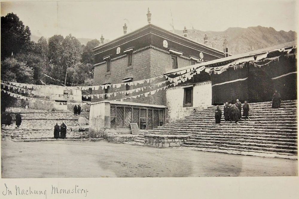 1985年,我在乃琼寺临摹壁画乃琼寺约翰·克劳德·怀特摄于1904年弗·斯·查普曼摄于1936年,画面中左上为哲蚌寺,右下为乃琼寺左:古代白哈尔唐卡局部右:1936年花园中的乃琼神谕洛桑朗杰、休·E·理查森拍摄乃琼寺距拉萨市中心10公里,寺内供奉着三头六臂白哈尔,那是藏传佛教格鲁派的护法主神,也是西藏历代最高级别神谕者的居住处。