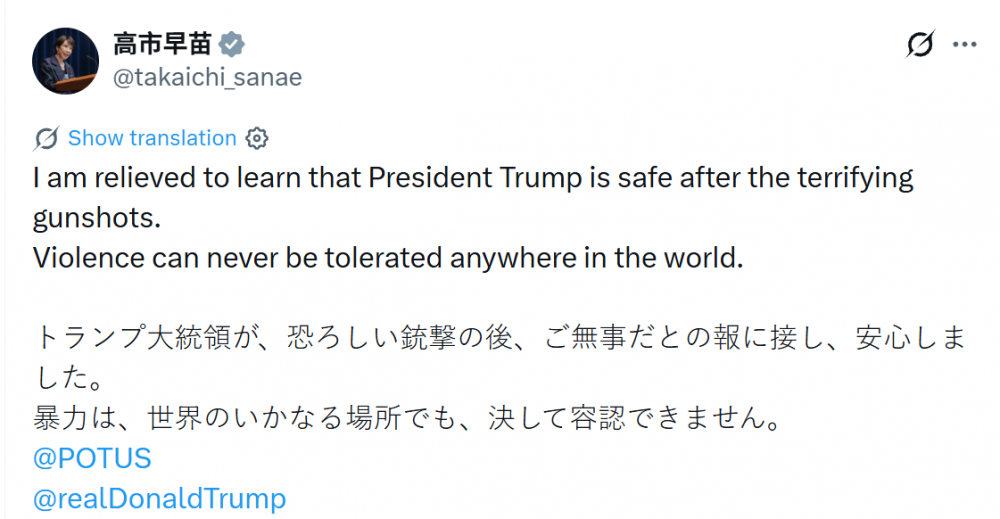 随后,日本首相高市早苗在X平台用英日双语发文称,得知特朗普总统在那令人惊恐的枪声之后安然无恙,我感到如释重负。