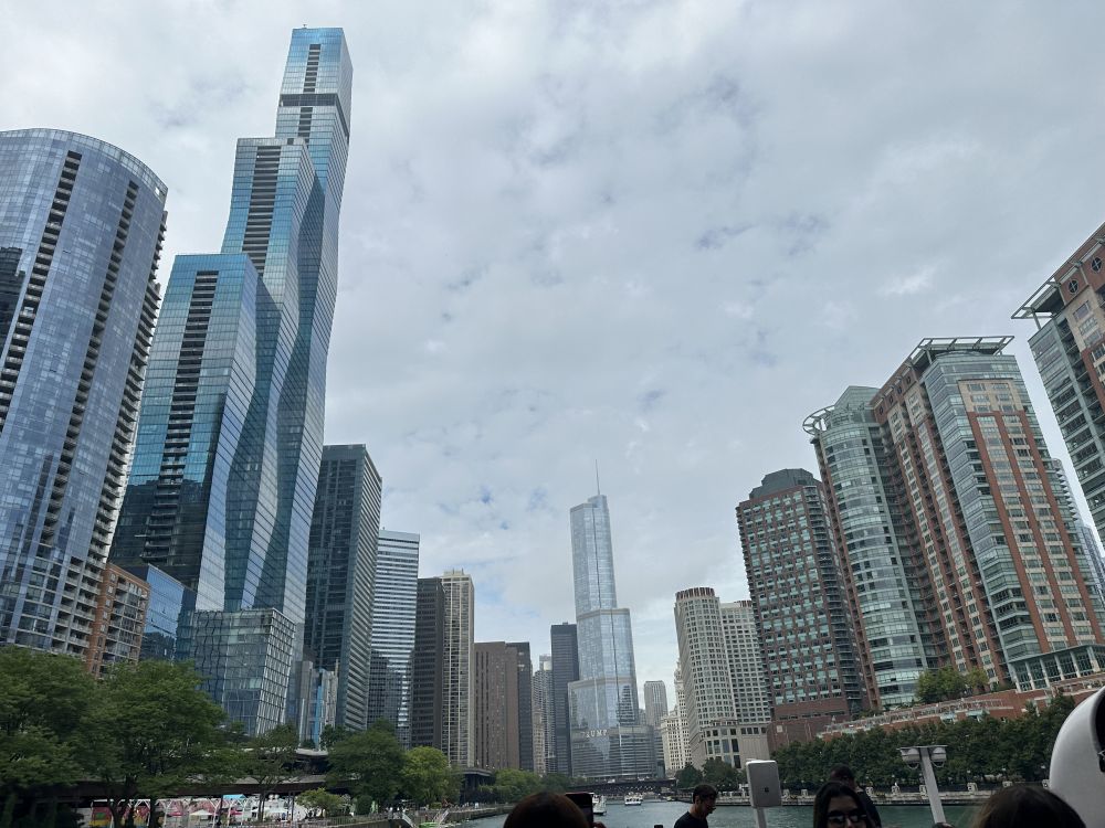 上船处就是芝加哥河岸川普大厦边,川普大厦也是一个iconic的存在。这座92层高的摩天大楼是芝加哥第二高建筑,仅次于威利斯大厦。2001年川普曾声称要建一个世界第一高楼的住宅楼,911事件后,他缩减开支,顾不上兑现承诺了,(他的贯常风格),最后建成了芝加哥第二,北美第五的这栋大楼。如今是一座集酒店、公寓和16个餐厅的大厦。这座摩天楼应该说外观还是很不错的,分三个部分,下盘很宽,往上第二部分细一点,第三部分更细一点。因为芝加哥是一座风城,风大啊,为了楼盘的稳定,需下面大上面小才行。