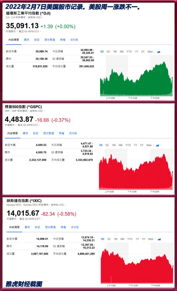 2022年2月7日美国股市收盘记录。