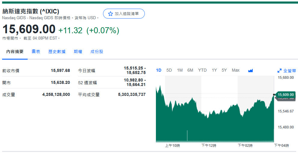 纳指收15,609.00+11.32 (+0.07%)