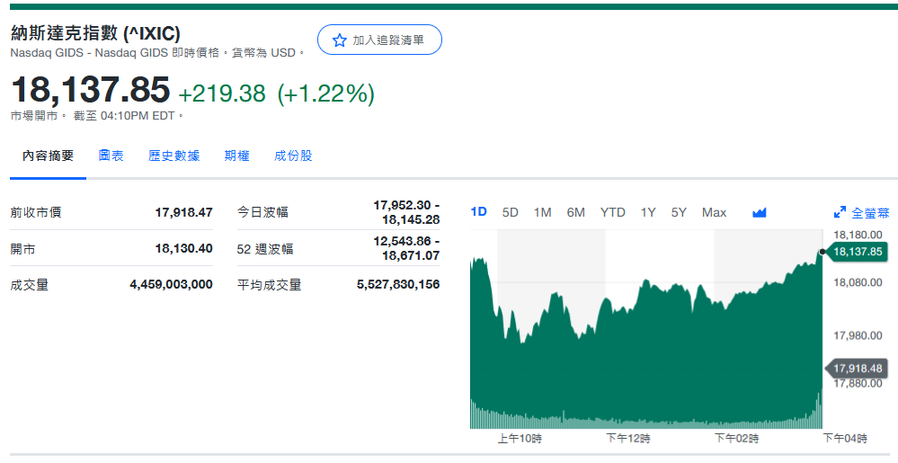 纳指收18,137.85+219.38 (+1.22%)